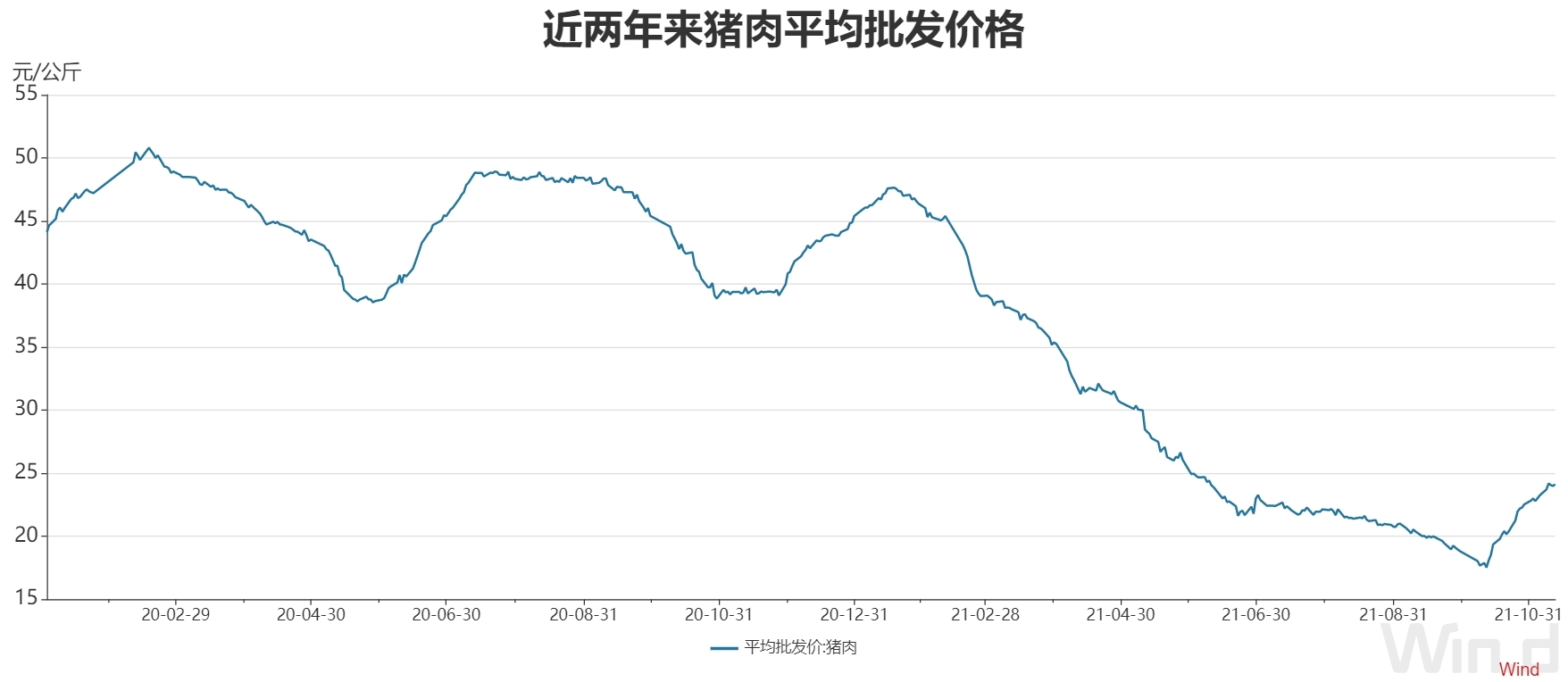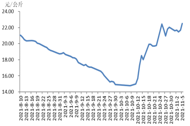 从10月初16省(直辖市)瘦肉型白条猪肉出厂价格平均值仅为每公斤15元左右,到11月初上涨至每公斤21.80元,短短一个月间,猪肉价格再次经历了急剧起伏的走势,环比涨幅达到约45%。