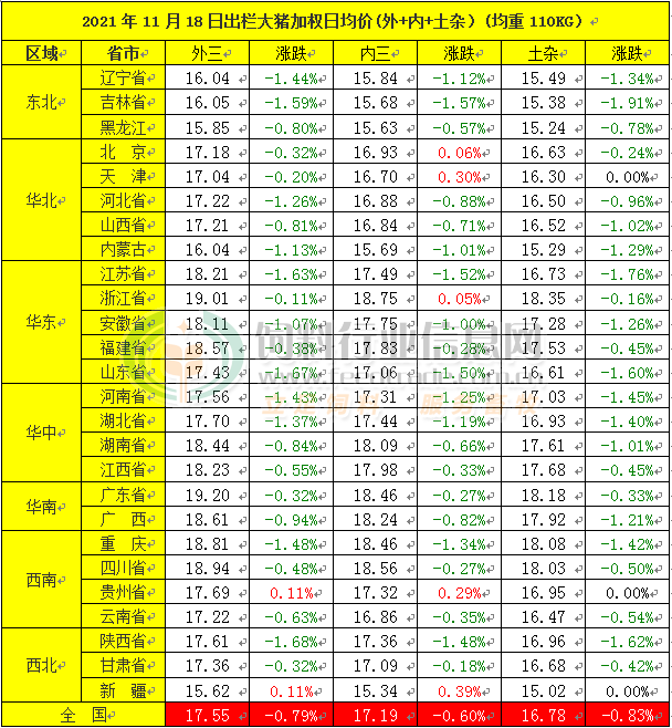 2021年11月18日,中国主流市场出栏外三元、内三元及土杂商品大猪综合日均价下跌,全国生猪出栏综合日均17.35元每公斤,相比昨天下跌0.73%。