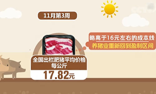 记者从农业农村部了解到,根据监测,今年6月至10月,全国生猪养殖总体处于亏损状态。随着肉价上涨,11月情况有所好转。11月第3周,全国出栏肥猪平均价格为每公斤17.82元,略高于16元左右的成本线,养猪业重新回到盈利区间。