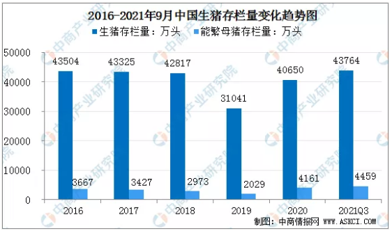 生猪产能完全恢复,能繁母猪存栏量、生猪存出栏量均超过2017年的水平。2021年三季度我国生猪存栏量达43764万头,其中能繁母猪存栏量达4459万头,高于农业农村部要求的3700万头。