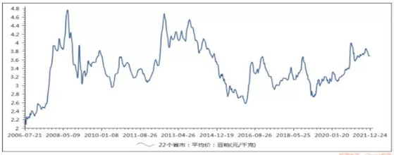 豆粕价格主要受大豆及豆油的市场价格、油脂厂的压榨效益、养殖行业景气程度等因素的影响,2018年以来的中美贸易摩擦也对大豆及豆粕价格产生一定影响。从2006年迄今我国豆粕市场价格波动较大,2018年10月达到约3700元/吨的高点,随后下行至2019年3月2600元/吨左右,此后价格有所反弹,呈现震荡走势。
