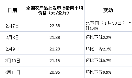 2月8日,截至14:00时,猪肉批发价格为21.88元/公斤,相比2月7日下降2.2%;2月9日,截至14:00时,猪肉批发价格为21.29元/公斤,比2月8日下降2.7%;2月10日,截至14:00时,猪肉批发价格为21.15元/公斤,相比前一天的价格,下降了0.7%;2月11日,猪肉批发价格为20.95元/公斤,环比下降0.9%。