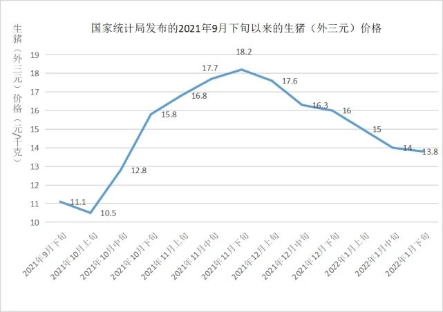 以生猪价格来看,如下图,据国家统计局的最新数据,1月中旬和1月下旬的生猪(外三元)价格,均为环比下降,1月中旬环比下降6.7%,1月下旬环比下降1.4%。