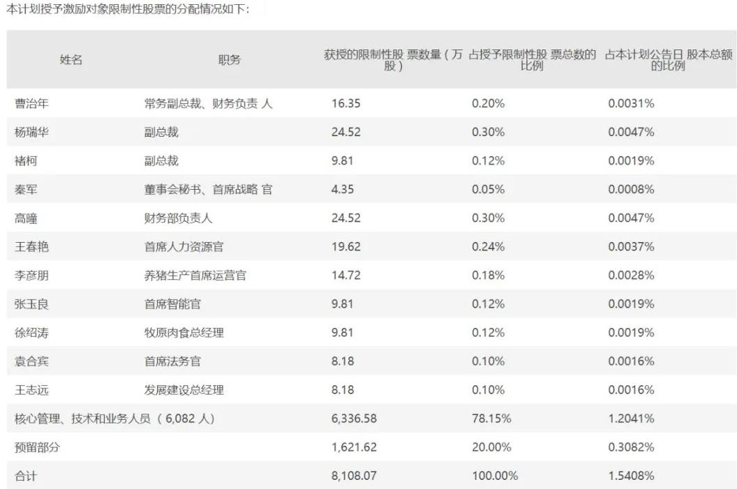 从具体分配情况来看,副总裁杨瑞华和财务部负责人高瞳获授的限制性股票数量最多,均为24.52万股,相当于“天降”700多万巨款;紧随其后,1992年出生的首席人力资源官王春艳获授19.62万股、养猪生产首席运营官李彦朋获授14.72万股。