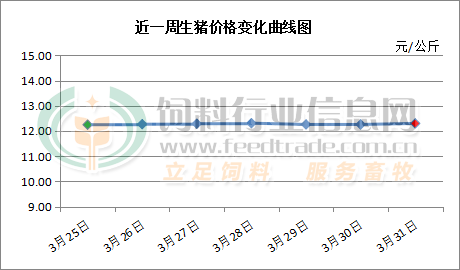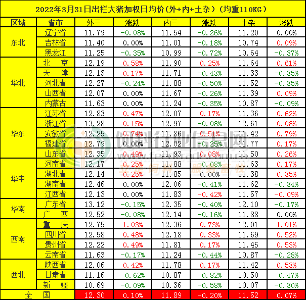 2022年3月31日,中国主流市场出栏外三元、内三元及土杂商品大猪加权日均价上涨,全国生猪出栏加权日均价12.19元每公斤,相比昨天上涨0.04%。