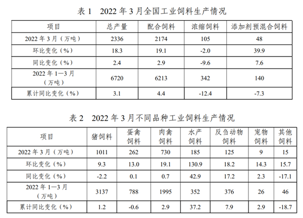 据样本企业数据测算,2022年3月,全国工业饲料总产量2336万吨,环比增长18.3%,同比增长2.4%。从品种看,猪饲料产量1011万吨,环比增长9.3%,同比下降2.2%;蛋禽饲料产量262万吨,环比增长13.0%,同比增长0.1%;肉禽饲料产量730万吨,环比增长19.1%,同比增长0.7%;水产饲料产量185万吨,环比增长130.9%,同比增长42.9%;反刍动物饲料产量125万吨,环比增长18.2%,同比增长17.2%。