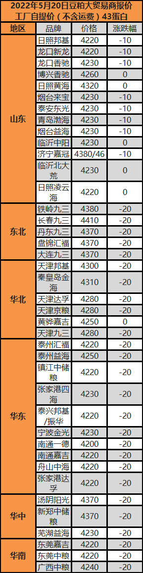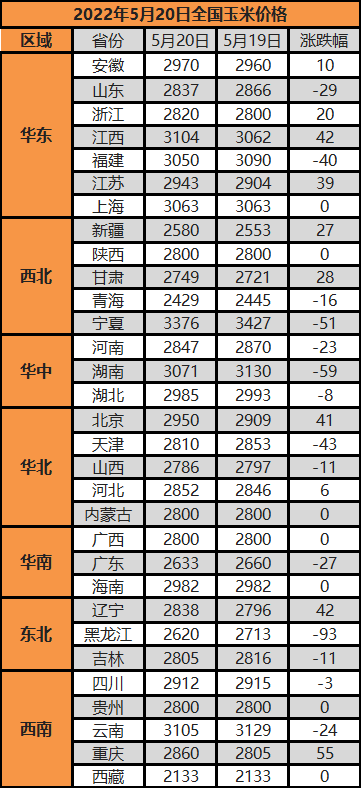 受出口禁令等影响,近期国内玉米价格持续小幅上涨,截止5月20日,云南、江西等地最高涨至3105元/吨。豆粕价格整体持稳,5月20日沿海区域主流报价在4250元/吨-4300元/吨。
