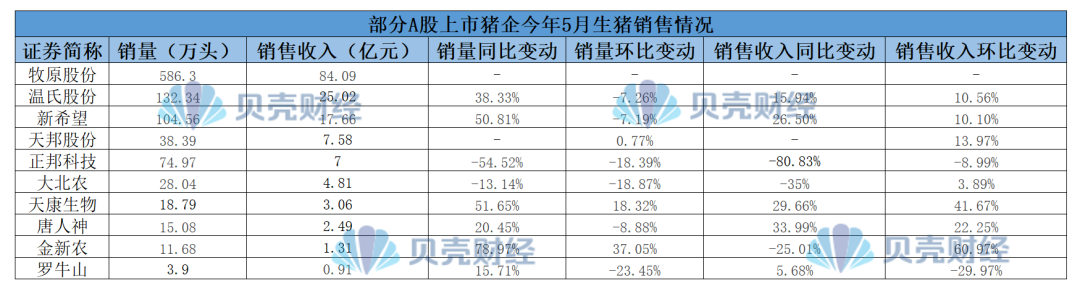 图注:部分A股上市猪企今年5月的生猪销售情况
