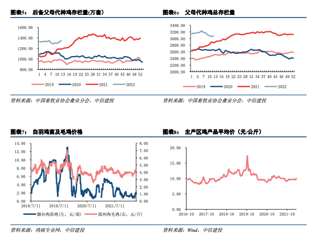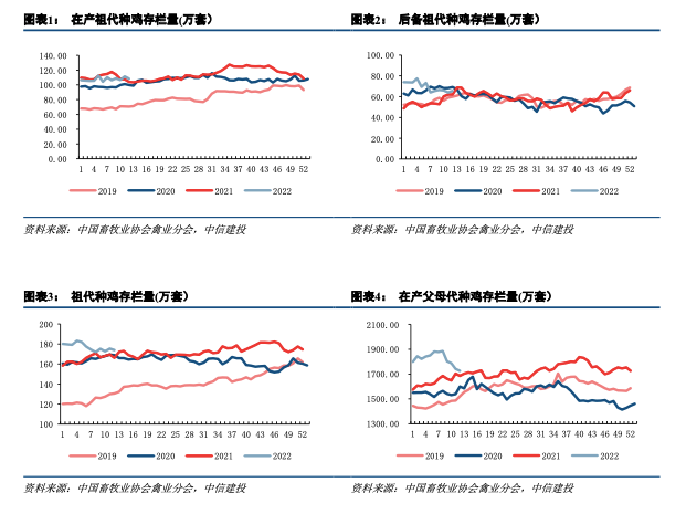 截至2022年3月第四周,在产祖代种鸡存栏108.41万套(同比+4.1%,环比-2.7%),后备祖代种鸡存栏65.61万套(同比+5.8%,环比+2.5%),祖代种鸡总存栏量174.02万套(同比+4.7%,环比-0.8%),祖代供应量依旧处于高位水平。②在产父母代种鸡存栏约1725.91万套(同比+2.4%,环比-0.9%),存栏量连续4周下降,但近期鸡苗价格回升或抑制产能去化趋势;后备父母代种鸡存栏约1347.56万套(同比+13.7%,环比+2.1%),父母代种鸡总存栏量3073.47万套(同比+7.1%,环比+0.4%)。综合来看,供给侧祖代产能及父母代产能依旧处在近3年高位水平;需求侧疫情爆发导致终端消费较为低迷,且猪价较低压制鸡肉消费;后续白羽鸡价、鸡苗价格以及鸡产品价格或仍有走弱可能。