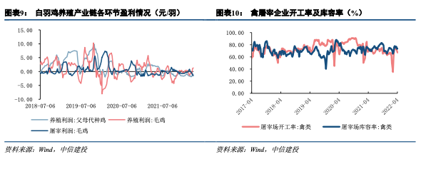 从供给端看,养殖成本高位运行叠加下游需求低迷,父母代种鸡养殖自2021年9月第二周持续处于亏损状态,截至2022年4月第一周,父母代种鸡养殖利润为-0.94元/羽,连续亏损长达30周。长期亏损导致父母代种鸡厂在前期开展淘鸡、抽毛蛋、种蛋转商品蛋等行为;持续去产能导致现在市场出苗量减少,鸡苗供应量较少。从需求端看,近期下游毛鸡价格上涨带动鸡苗价格回升,并提振养殖户补栏情绪,养殖场加快收苗孵化节奏,对鸡苗需求相对较强。