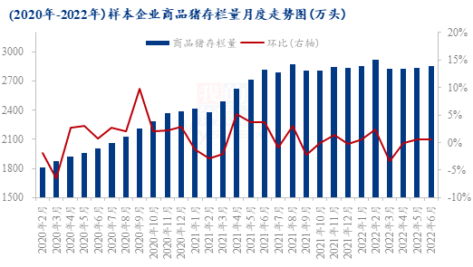 商品猪2022年上半年存栏量整体呈偏稳下降趋势,其中2月份出栏天数减少,商品猪被动压栏,环比增加2.34%;3月后因猪价下跌等因素存栏量持续减少;5月之后猪价逐步回升至成本线附近,养殖场亏损局面得以缓解,存栏量开始环比转正。
