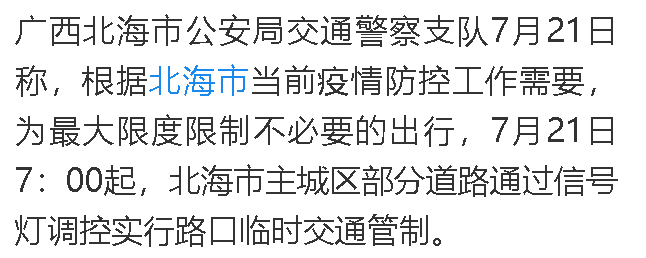 北海市决定从7月24日起对海城区、银海区部分区域实行为期三天的提级管控措施。