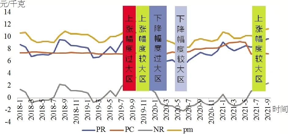 注:PR是鸡蛋出厂价格、PC是鸡蛋成本价格、NR是每公斤鸡蛋所获得的净利润,PM是鸡蛋集市价格。