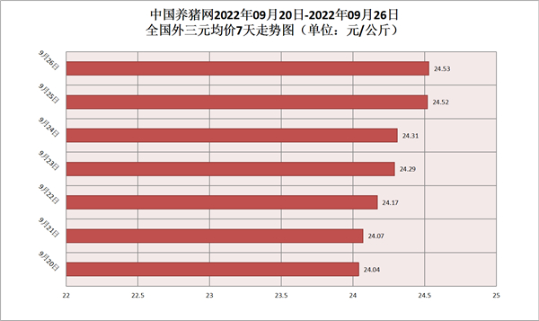 2022年09月26日(星期一),据中国养猪网猪价系统监测,全国外三元均价为24.53元/公斤,猪价较昨日(24.52元/公斤)上涨了0.01元/公斤,较上月(22.44元/公斤)上涨了2.09元/公斤。