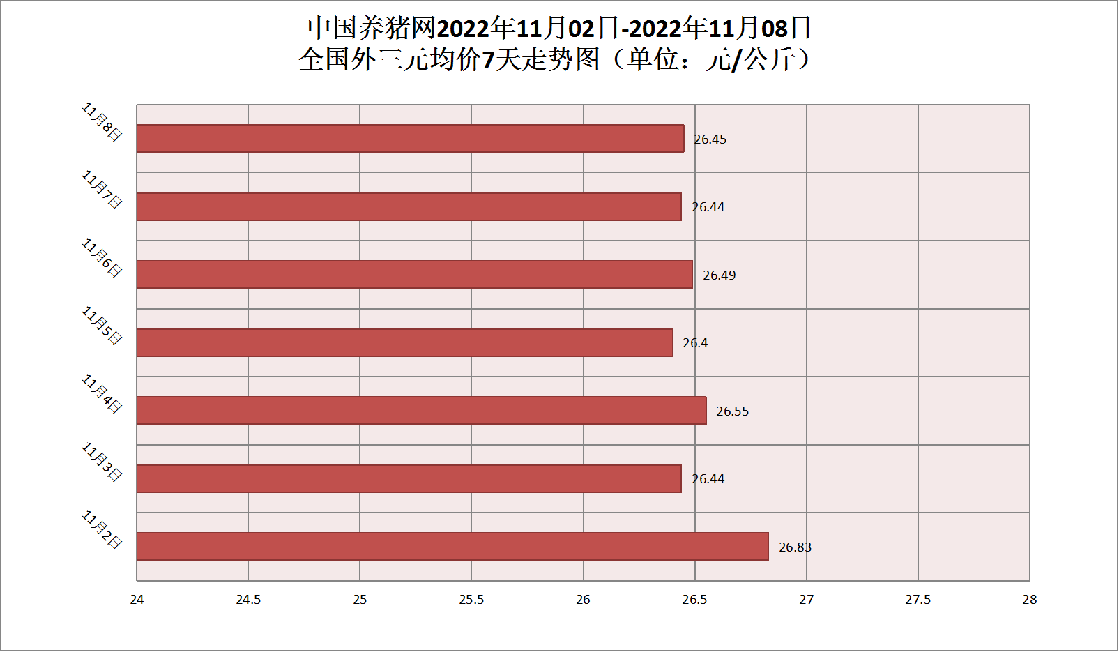 2022年11月08日(星期二),据中国养猪网猪价系统监测,全国外三元均价为26.45元/公斤,猪价较昨日(26.44元/公斤)上涨了0.01元/公斤,较上月(26.28元/公斤)上涨了0.17元/公斤。