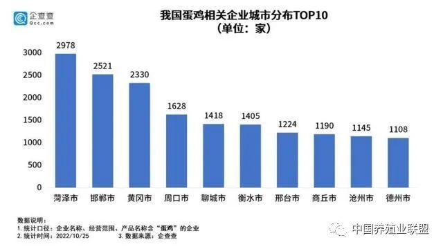 企查查数据显示,截至今年10月25日,我国现存蛋鸡相关企业6.6万家。山东省以现存1.1万家蛋鸡相关企业,领先其他省份。河南、河北分别有蛋鸡相关企业9780家、9005家,位列前三。从城市分布来看,菏泽市现存蛋鸡相关企业数量最多,为2978家,接下来排名前十的城市依次是邯郸市、黄冈市、周口市、聊城市、衡水市、邢台市、商丘市、沧州市、德州市。