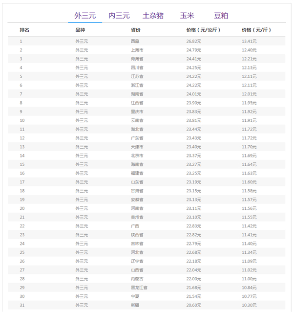 全国外三元生猪价格排行榜