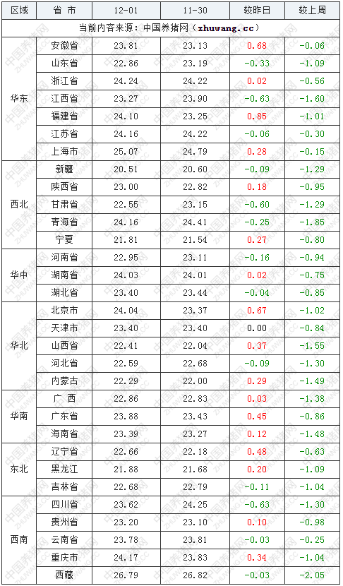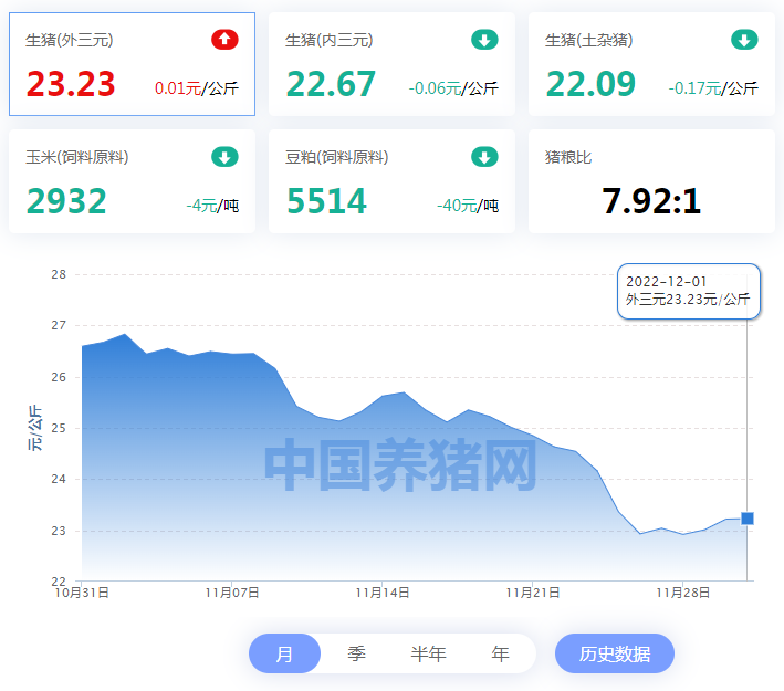 2022年12月01日-中国养猪网全国外三元猪价格走势图及涨跌表