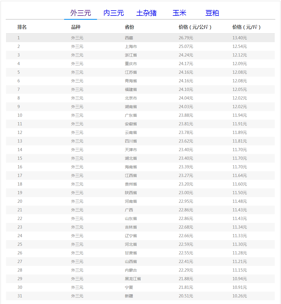 外三元排行前三:西藏自治区26.79元/公斤、上海市25.07元/公斤、浙江省24.24元/公斤;