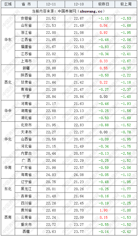 猪价下跌地区(22个):安徽省、江西省、江苏省、青海省、河北省、广西壮族自治区、广东省、四川省、西藏自治区、福建省、陕西省、河南省、湖北省、山西省、内蒙古自治区、海南省、辽宁省、重庆市、湖南省、黑龙江省、吉林省、北京市;下跌区间为0.05-1.15元/公斤;