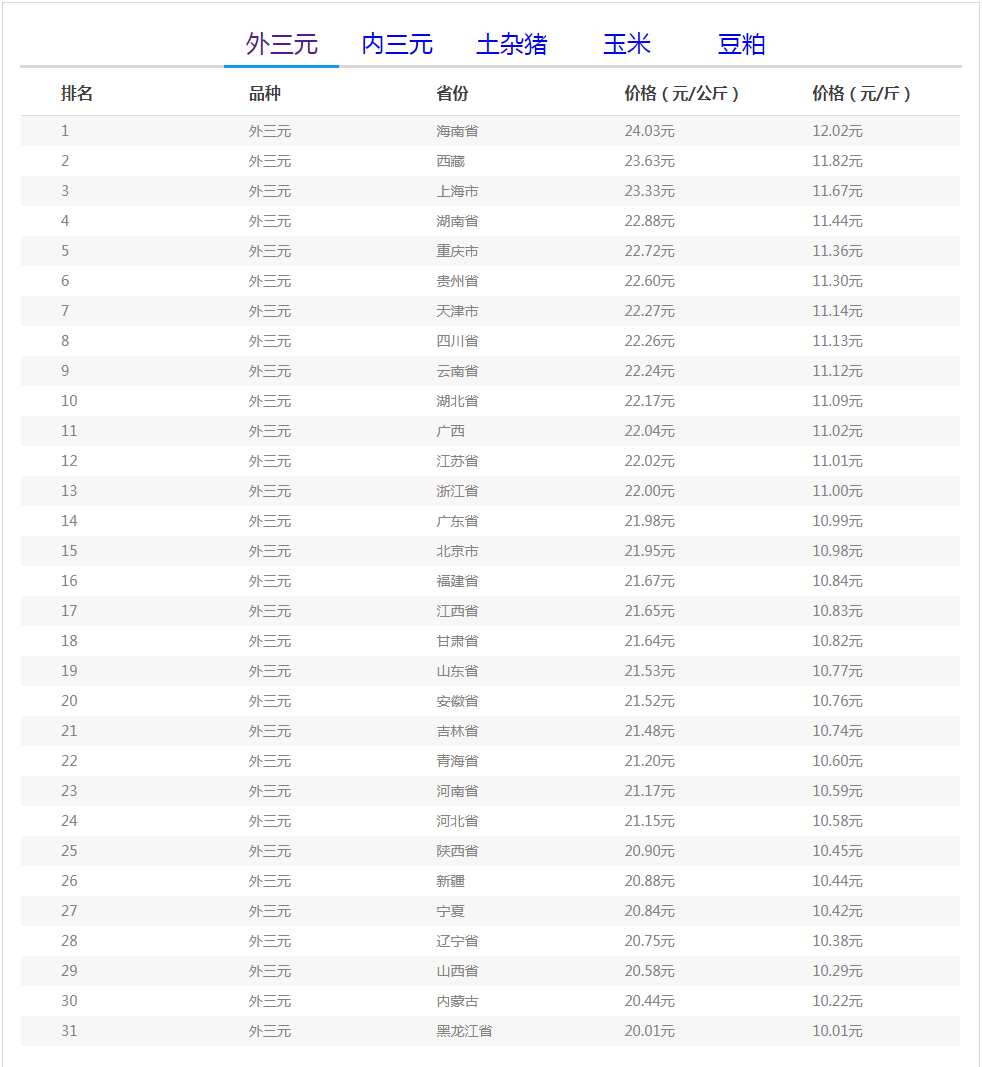 外三元排行后三:黑龙江省20.01元/公斤、内蒙古自治区20.44元/公斤、山西省20.58元/公斤;