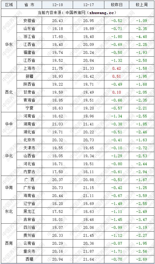 2022年12月18日-中国养猪网全国外三元猪价格走势图及涨跌表