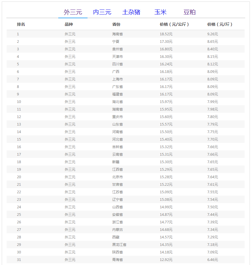 全国外三元猪价格排行榜