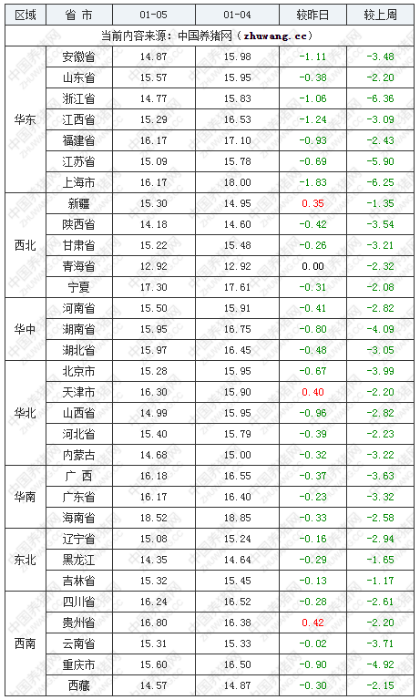 猪价下跌地区(27个):安徽省、浙江省、北京市、江西省、江苏省、河南省、湖南省、广西壮族自治区、福建省、山东省、内蒙古自治区、辽宁省、西藏自治区、四川省、甘肃省、宁夏回族自治区、湖北省、山西省、河北省、广东省、海南省、黑龙江省、吉林省、云南省上海市、陕西省、重庆市;下跌区间0.02-1.83元/公斤;