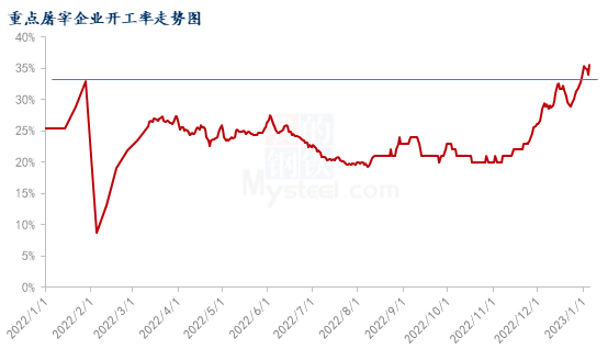 元旦期间,国内需求继续改善,元旦过后距离春节不足20天,年味渐浓,虽然南方腌腊基本结束,但下游基层常规消费、灌肠、节前备货等活动在增多。经过12月毛猪及白条大幅下跌,白条跌至低位区间内,对提振节前消费带来较好条件。此外,流通环节的猪肉贸易商也有增加订单屯货,助力屠企白条订单增加,最近几日样本屠企日宰量升至17.0万-18.0万头的较高水平。元旦之后的第一周屠宰开工率34.61%,较上周上涨3.88个百分点,高于同期9.25个百分点。