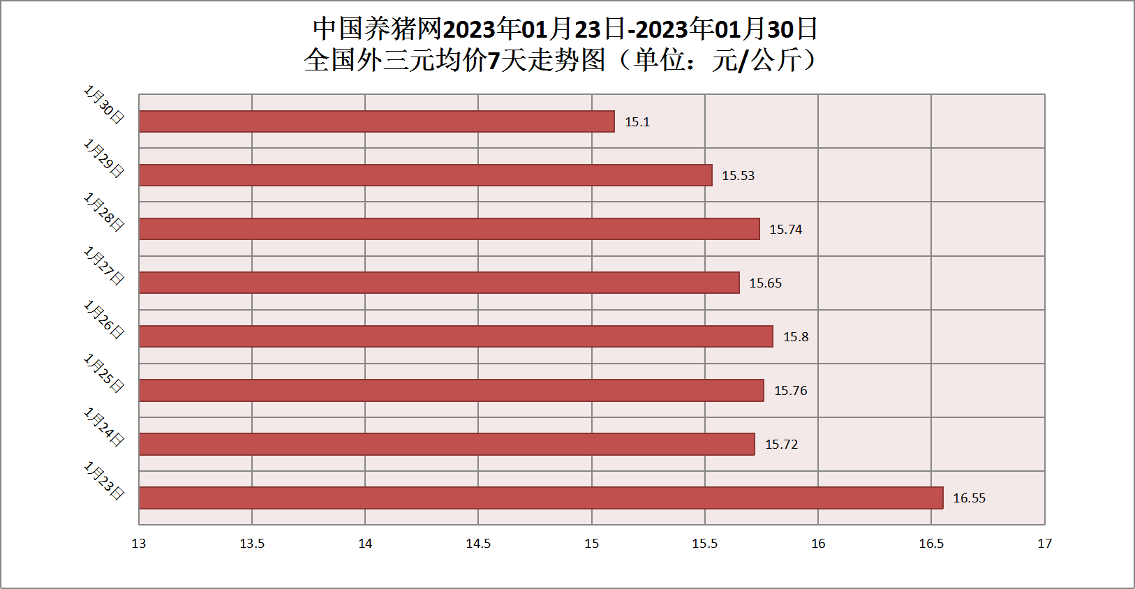 2023年01月30日(星期一),据中国养猪网猪价系统监测,全国外三元均价为15.10元/公斤,猪价较昨日(15.53元/公斤)下跌了0.43元/公斤,较上月(18.18元/公斤)下跌了2.65元/公斤。