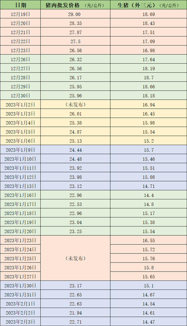 据农业农村部监测,2月3日,全国农产品批发市场猪肉平均价格为22.71元/公斤,与上周六(1月28日)的23.24元/公斤相比,下降2.3%。本周的平均价格为22.6元/公斤,上周未公布数据,与上上周22.9元/公斤的均价相比,基本持平。