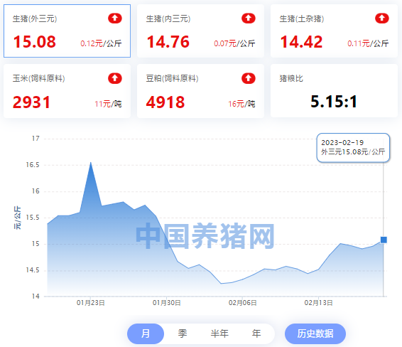 全国(生猪品种:外三元)均价为15.08元/公斤,猪价较昨日上涨了0.12元/公斤,环比下跌1.95%,同比上涨18.83%;