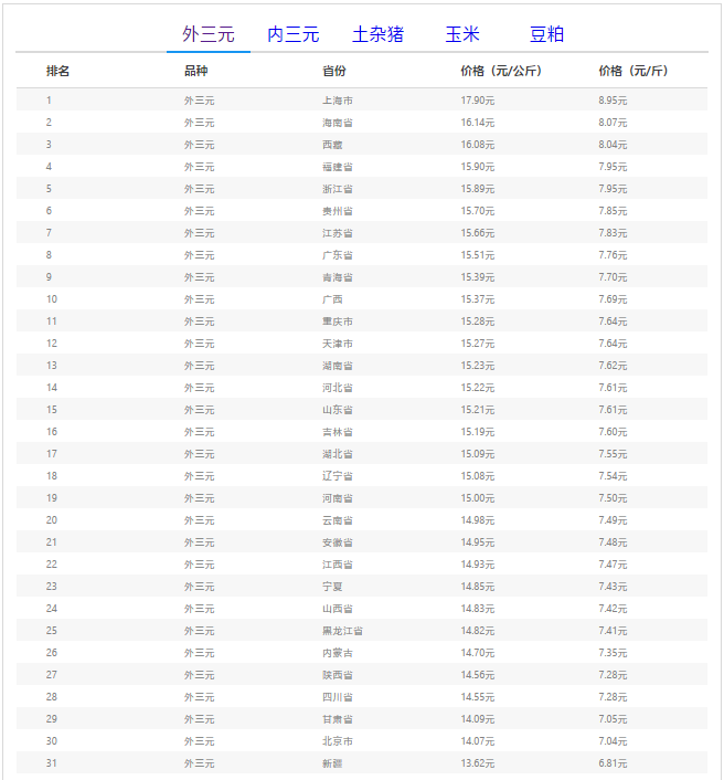外三元排行前三:上海市17.90元/公斤、海南省16.14元/公斤、西藏自治区16.08元/公斤;