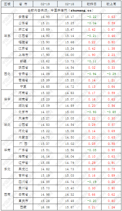 猪价上涨地区(22个):安徽省、浙江省、江苏省、陕西省、青海省、宁夏回族自治区、湖北省、山西省、河北省、西藏自治区、广西壮族自治区、海南省、辽宁省、黑龙江省、上海市、河南省、天津市、湖南省、吉林省、贵州省、云南省、内蒙古自治区;上涨区间为0.02-1.90元/公斤;