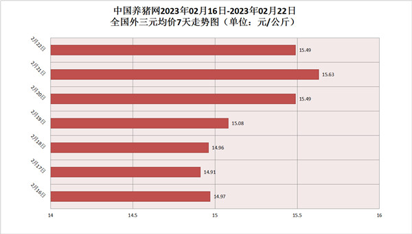 2023年02月22日(星期三),据中国养猪网猪价系统监测,全国外三元均价为15.49元/公斤,猪价较昨日(15.63元/公斤)下跌了0.14元/公斤,较上月(15.60元/公斤)下跌了0.11元/公斤。