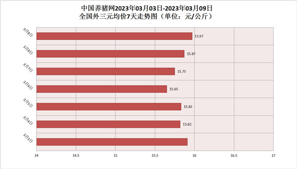 2023年03月09日(星期四),据中国养猪网猪价系统监测,全国外三元均价为15.97元/公斤,猪价较昨日(15.87元/公斤)上涨了0.10元/公斤,较上月(14.33元/公斤)上涨了1.64元/公斤。