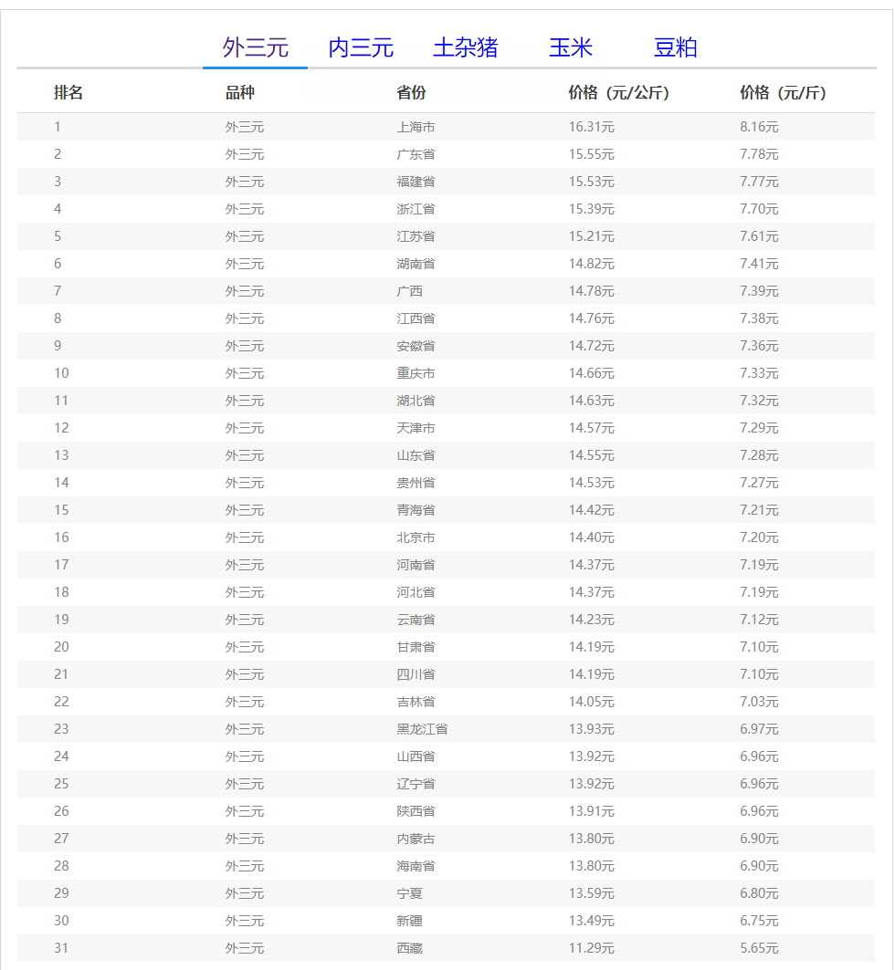 外三元排行后三:西藏自治区11.29元/公斤、新疆维吾尔自治区13.49元/公斤、宁夏回族自治区13.59元/公斤;
