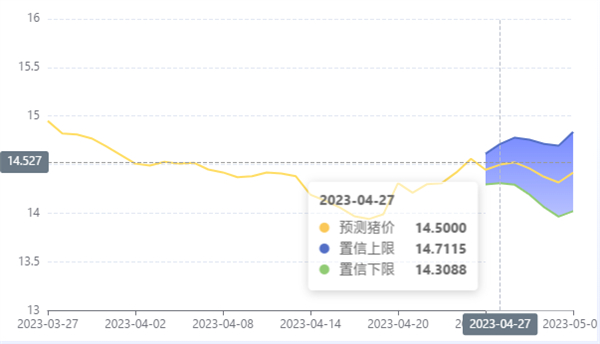 玄田算法是由项目课题组团队原创的非经典逻辑数值聚合理论和不确定性预测方法,构建了基于一致模算子的生猪价格预测模型。根据玄田算法预测,4月27日预测猪价为14.5000,置信区间在14.3088--14.7115之间。4月28日预测猪价为14.5238;4月29日预测猪价为14.4616。
