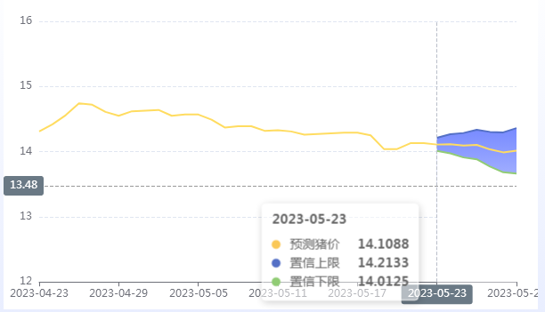 玄田算法是由项目课题组团队原创的非经典逻辑数值聚合理论和不确定性预测方法,构建了基于一致模算子的生猪价格预测模型。该模型采用的聚合函数及一致模相关理论与方法已获得多项国家自然科学基金和省级自然科学资金资助,并获得多项省级自然科学奖奖项。5月23日预测猪价为14.1088,置信区间在14.0125--14.2133之间。5月24日预测猪价为14.1145;5月25日预测猪价为14.0922。