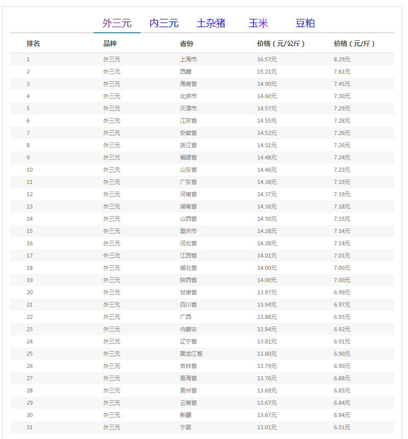 全国外三元生猪价格排行榜