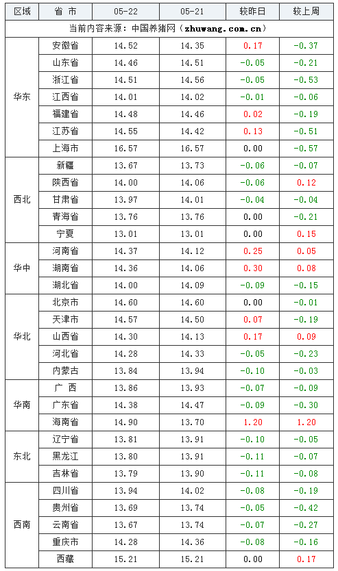 猪价持平地区(5个):上海市、青海省、宁夏回族自治区、北京市、西藏自治区;