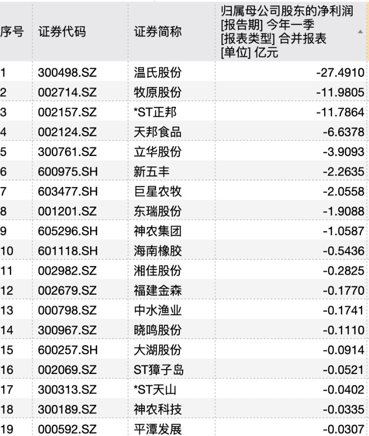 猪肉价格持续下跌,一季度上市猪企亦是难过。记者根据wind数据统计,2023年一季度,19家龙头猪企亏损近百亿元。其中,牧原股份(002714)、新希望(000876)、温氏股份(300498)、正邦科技(002157)亏损较多,占亏损总额的7成左右。