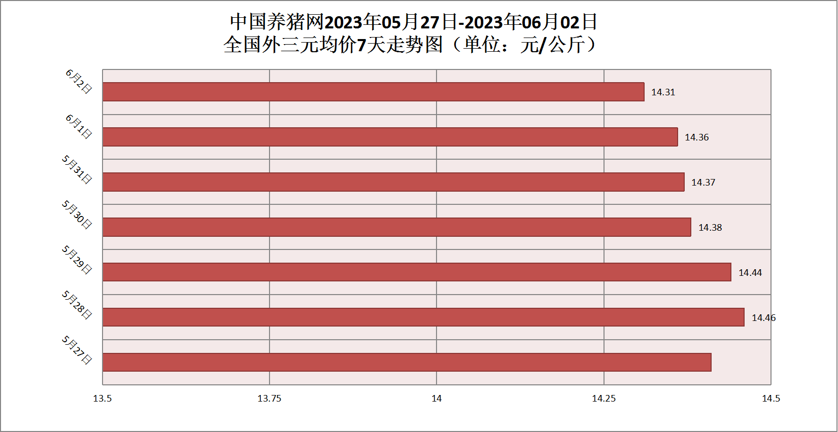 2023年06月02日(星期五),据中国养猪网猪价系统监测,全国外三元均价为14.31元/公斤,猪价较昨日(14.36元/公斤)下跌了0.05元/公斤,较上月(14.64元/公斤)下跌了0.33元/公斤。