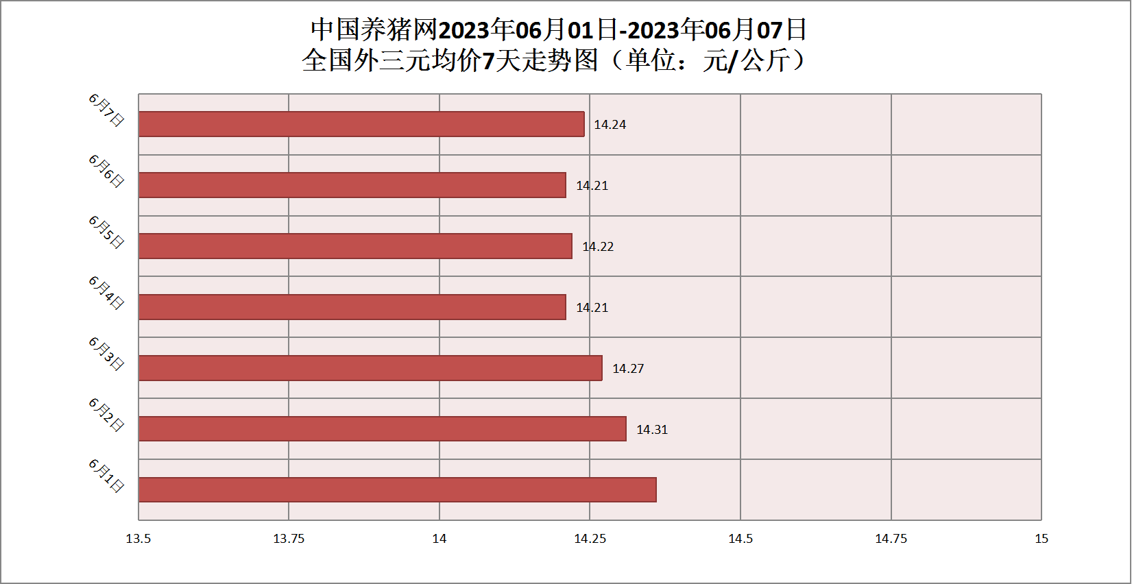 2023年06月07日(星期三),据中国养猪网猪价系统监测,全国外三元均价为14.24元/公斤,猪价较昨日(14.21元/公斤)上涨了0.03元/公斤,较上月(14.37元/公斤)下跌了0.13元/公斤。