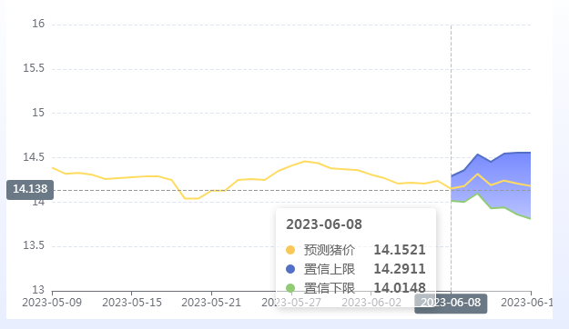 玄田算法是由项目课题组团队原创的非经典逻辑数值聚合理论和不确定性预测方法,构建了基于一致模算子的生猪价格预测模型。该模型采用的聚合函数及一致模相关理论与方法已获得多项国家自然科学基金和省级自然科学资金资助,并获得多项省级自然科学奖奖项。6月8日预测猪价为14.1521,置信区间在14.0148--14.2911之间。6月9日预测猪价为14.1808;6月10日预测猪价为14.3182。