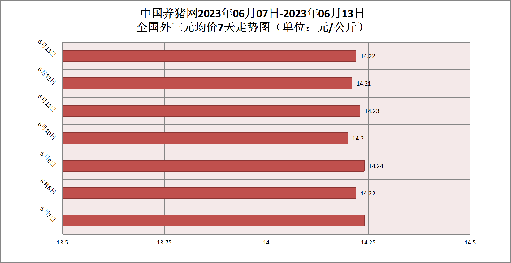 2023年06月13日(星期二),据中国养猪网猪价系统监测,全国外三元均价为14.22元/公斤,猪价较昨日(14.21元/公斤)上涨了0.01元/公斤,较上月(14.26元/公斤)下跌了0.04元/公斤。