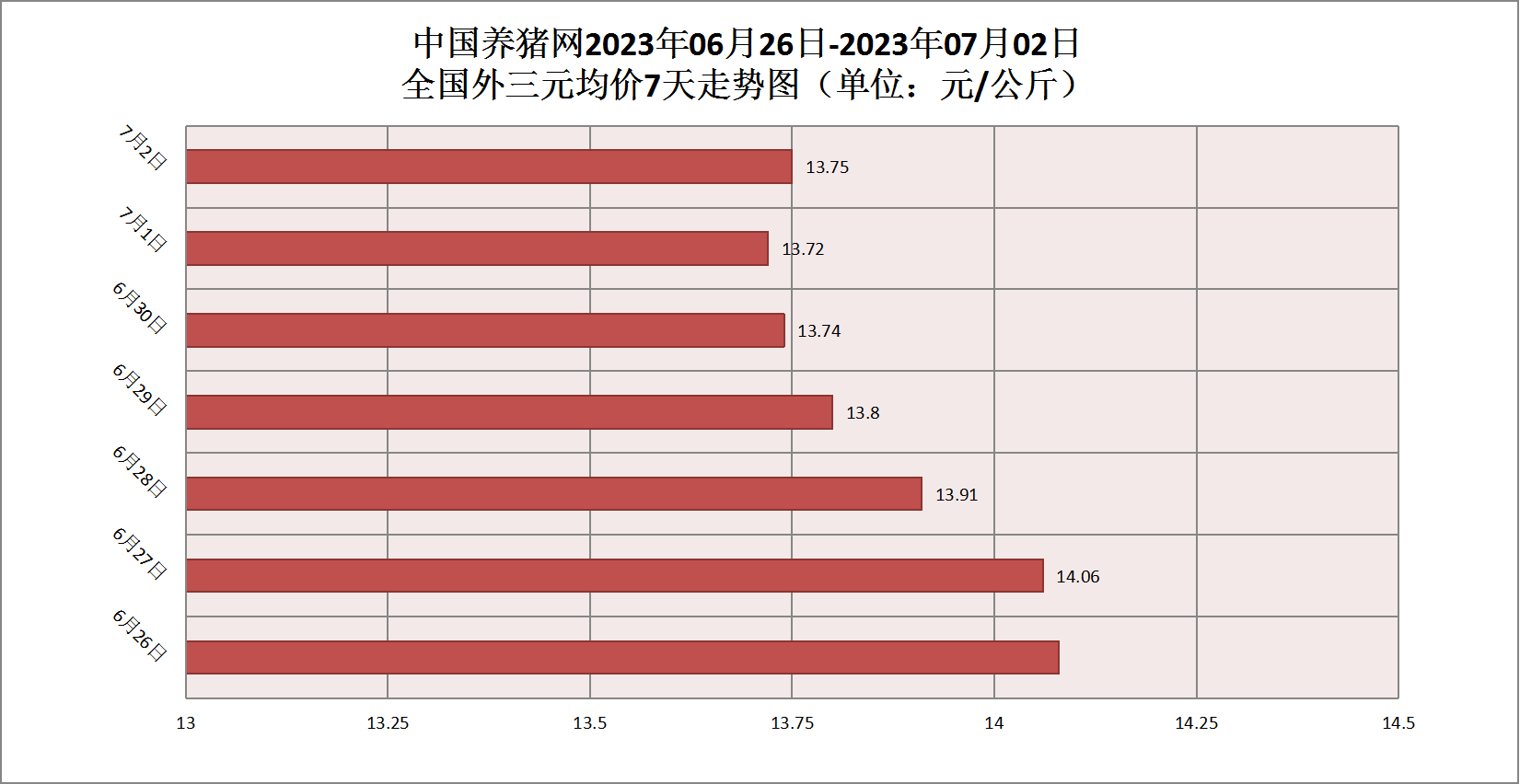 2023年07月02日(星期日),据中国养猪网猪价系统监测,全国外三元均价为13.75元/公斤,猪价较昨日(13.72元/公斤)上涨了0.03元/公斤,较上月(14.36元/公斤)下跌了0.61元/公斤。