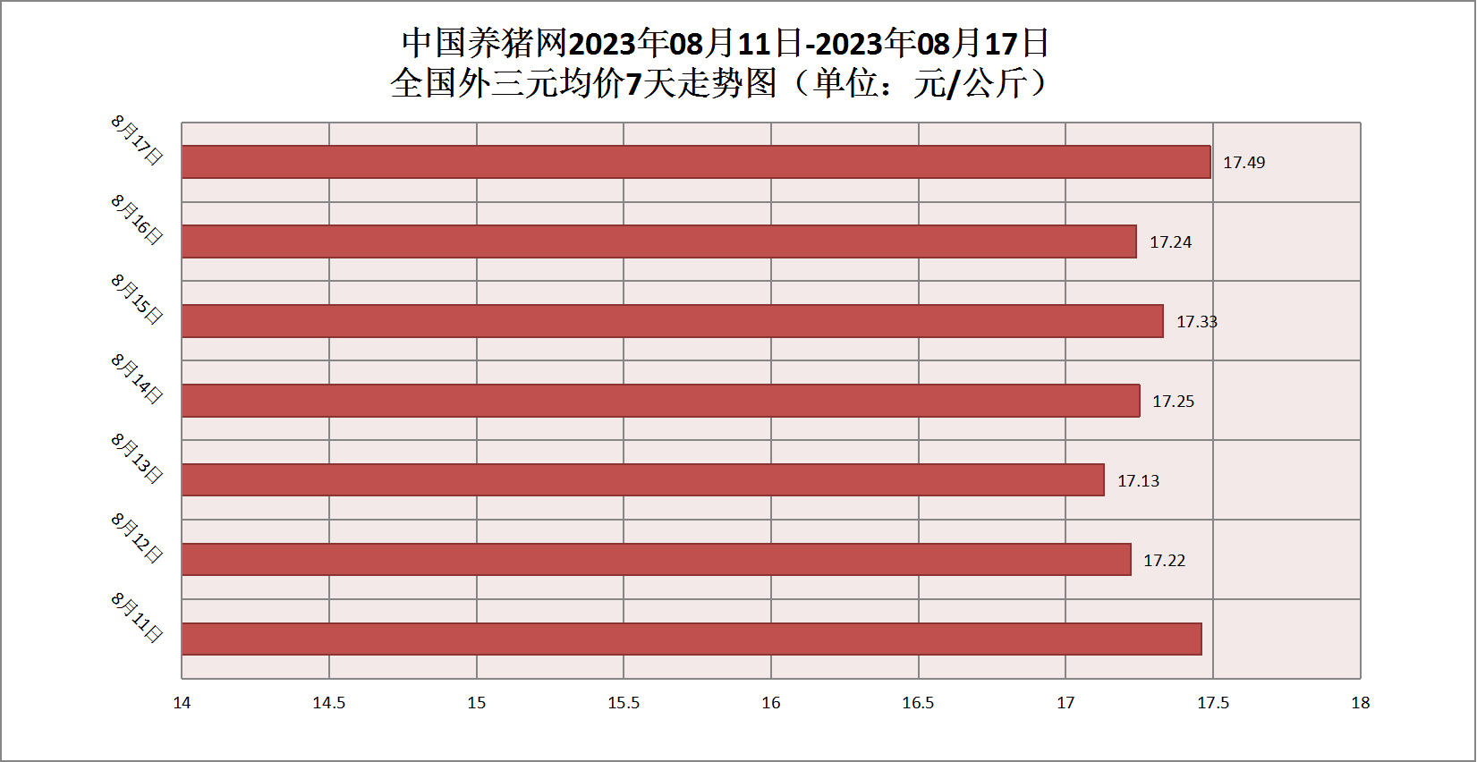 2023年08月17日(星期四),据中国养猪网猪价系统监测,全国外三元均价为17.49元/公斤,猪价较昨日(17.24元/公斤)上涨了0.25元/公斤,较上月(13.97元/公斤)上涨了3.52元/公斤。