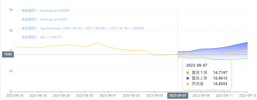玄田算法是由项目课题组团队原创的非经典逻辑数值聚合理论和不确定性预测方法,构建了基于一致模算子的生猪价格预测模型。该模型采用的聚合函数及一致模相关理论与方法已获得多项国家自然科学基金和省级自然科学资金资助,并获得多项省级自然科学奖奖项。09月07日预测猪价为16.8503,置信区间在16.7197--16.9615之间。09月08日预测猪价为16.8229;09月09日预测猪价为16.8989。