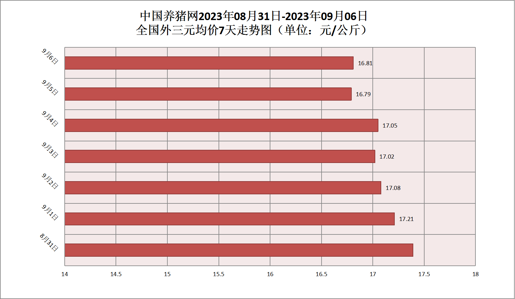 2023年09月06日(星期三),据中国养猪网猪价系统监测,全国外三元均价为16.81元/公斤,猪价较昨日(16.79元/公斤)上涨了0.02元/公斤,较上月(17.35元/公斤)下跌了0.54元/公斤。